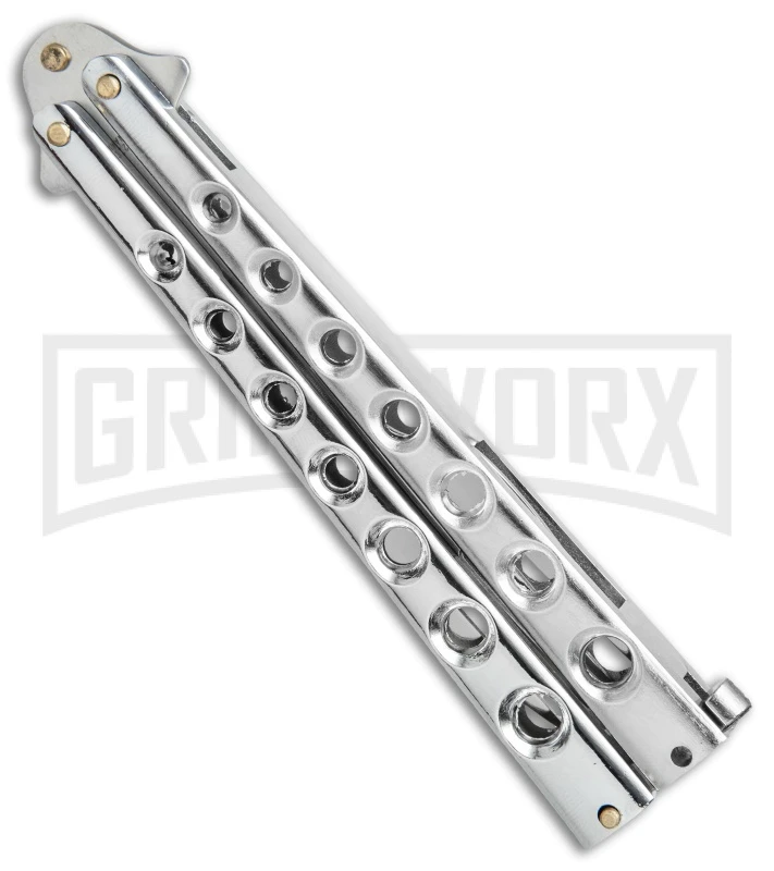 Keep your flipping skills finely honed with this Butterfly Trainer fork from Caliber Gourmet. It features a fully functional fork on the blade, so you can safely practice butterfly tricks without cutting up your hands. The handles are made from skeletonized aluminum with a latch for securing the blade in the open or closed position. This model has a satin finished handle and fork.