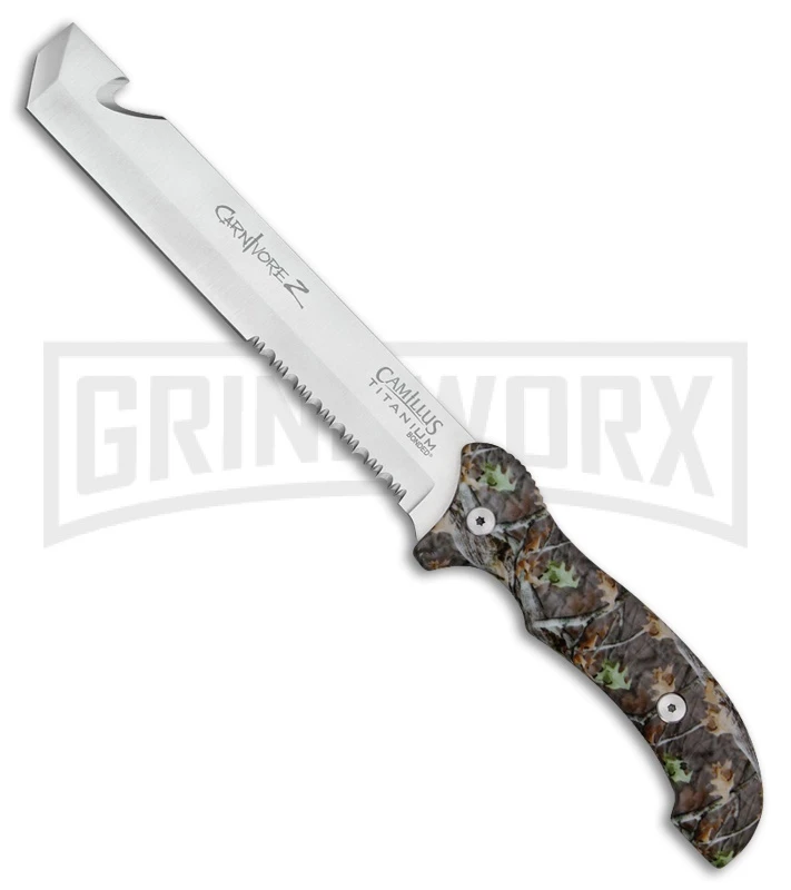 The Camillus Carnivore Z is a machete for defending yourself against the undead or clearing trails. Its forward weighted balance of the blade makes chopping through dense brush, tree limbs, and wood easy work. The 440 stainless steel, chisel blade has a wire cutter, partially serrated edge, and a satin finish. The handle is made of green camo rubber over a full tang construction, providing good traction in all weather conditions. It comes with a black nylon belt sheath.