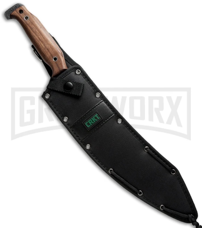 A blade thats curved up to make brush go down hard. Liong Mah was looking for a survival machete he could use in a variety of situations. So he designed this smaller sized one with a distinctive upswept overall shape. A walnut handle with lanyard holes allows for a forward carry thats secure.