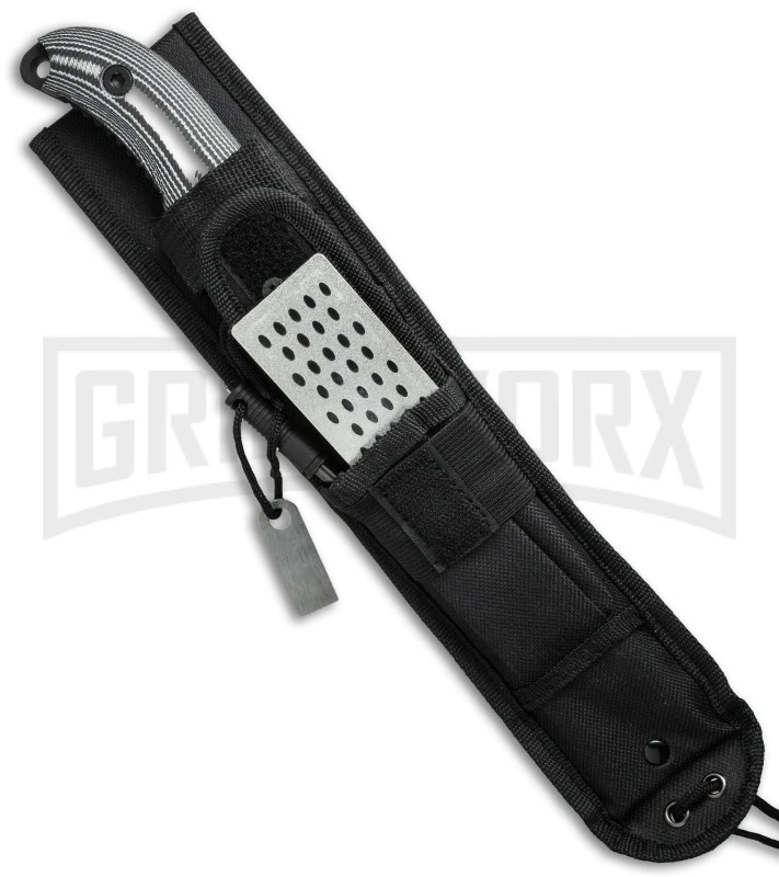 The SCHF37M is part of Schrade’s Extreme Survival series of knives, which feature tough black powder coated full-tang steel construction with textured black/gray Micarta scales. Included with the heavy duty nylon sheath is a ferro rod and sharpening stone. This model has a large 7 inch long no nonsense drop point blade.