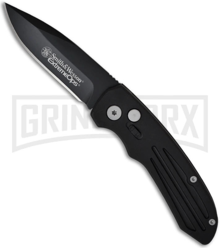 The Smith & Wesson Extreme Ops SW50B is a great quality knife with fast action at a low price. The black finished 440 stainless steel drop point blade has a plain cutting edge. The push button quickly deploys the blade of this automatic conversion knife. The black coated aluminum handle features grooves to increase grip. The stainless steel pocket clip is tip-down for easy carry. This version of the SW50 has a front mounted safety!