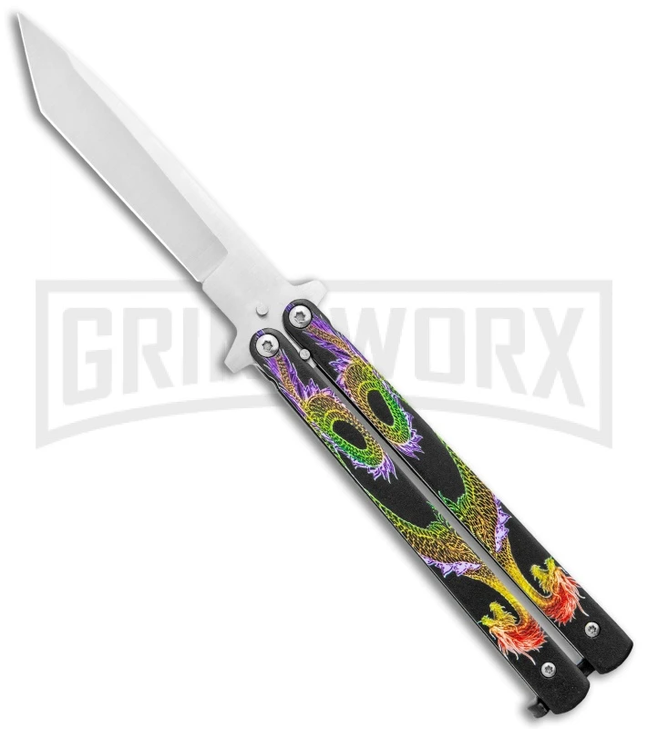 This butterfly knife has solid, lightweight action. It features black steel handles with dragon engravings. The 440C stainless steel, plain edge, tanto blade has two tang pins, which results in tighter lock-up and less blade wear.